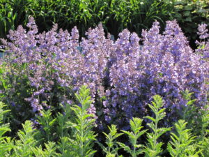 Cette vivace aussi appelé menthe de chat, a un feuillage gris vert aromatique. Ses fleurs sont bleu lavande et sa floraison se poursuit sur une longue période. Tailler après la floraison pour en encourager une nouvelle.